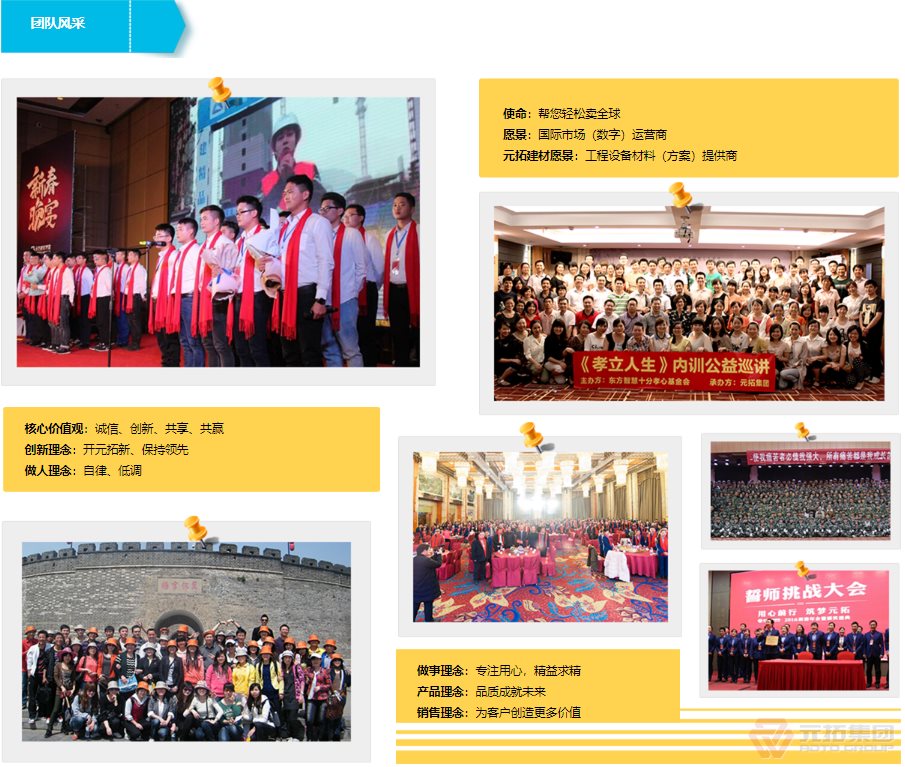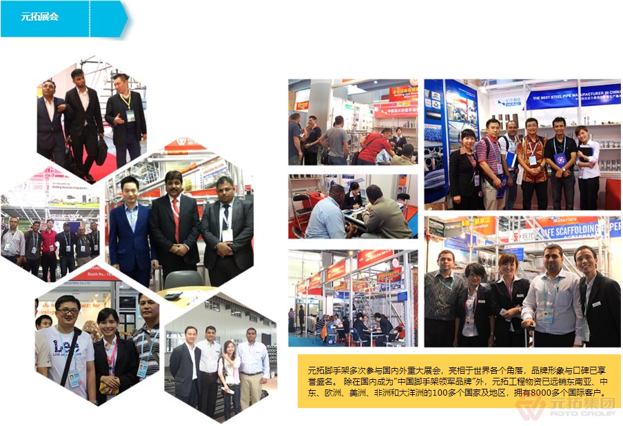湖南元拓建材集團(tuán)股份有限公司(簡稱:元拓建材集團(tuán))始創(chuàng)于1998年,以工程最前端的腳手架、鋁合金模板等產(chǎn)品為基礎(chǔ),現(xiàn)已發(fā)展成為集房產(chǎn)、工程、材料全產(chǎn)業(yè)鏈服務(wù)及多元化發(fā)展的大型實(shí)業(yè)集團(tuán)。元拓模架產(chǎn)業(yè)鏈板塊(簡稱元拓模架)隸屬于湖南元拓建材集團(tuán),提供模架產(chǎn)業(yè)鏈解決方案––全系模架產(chǎn)品(含國際)、模架租賃及托管、勞務(wù)施工、數(shù)字模架、營銷訂單解決方案、應(yīng)收解決方案。 元拓模架深耕全球市場(chǎng)24年,目前擁有天津和順昌、湖北元拓鋁模兩大模架生產(chǎn)基地,長沙、青島、廣州三大子公司,埃及、印尼、迪拜、菲律賓等10多家海外子公司/辦事處。是中國石油、中國石化等世界知名石化施工企業(yè)指定供應(yīng)商和世界各國優(yōu)秀工程施工企業(yè)長期戰(zhàn)略合作伙伴,銷售網(wǎng)絡(luò)遍布多個(gè)國家和地區(qū)。