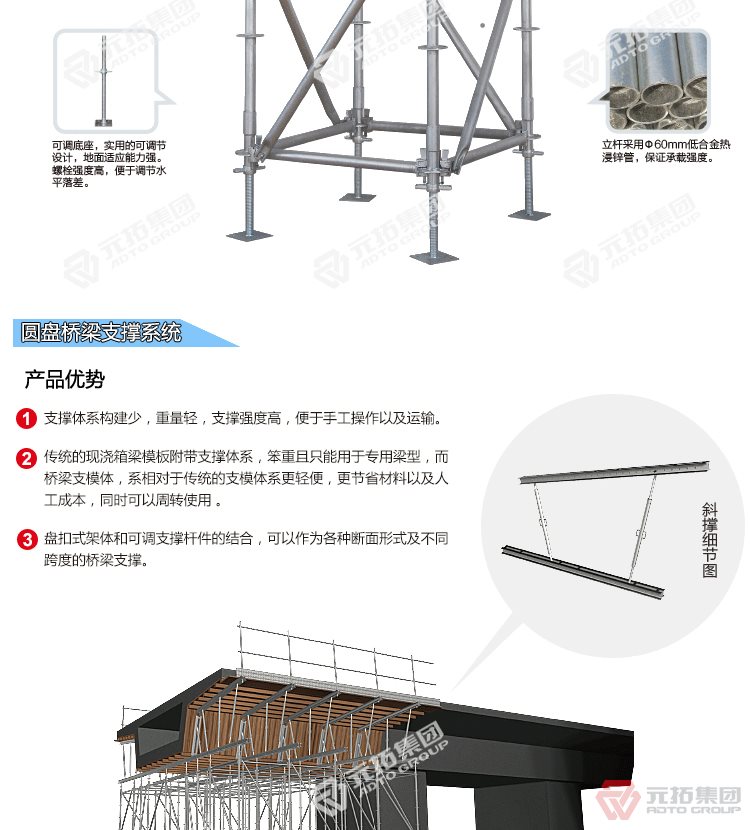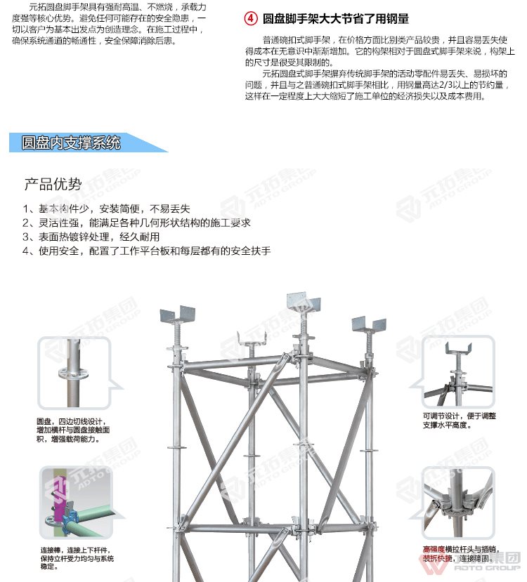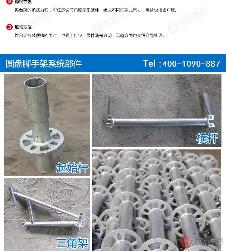 腳手架批發(fā)找元拓,天津和順昌是元拓集團(tuán)天津工廠直銷(xiāo)盤(pán)式腳手架,圓盤(pán)式腳手架具有基本構(gòu)件少、架設(shè)及拆卸作業(yè)方便、施工工效高、承載力強(qiáng)等特點(diǎn),被廣泛應(yīng)用于橋梁、隧道、電力、石化、造船、鐵路、機(jī)場(chǎng)、碼頭等工業(yè)及民用建筑的工程領(lǐng)域。相對(duì)于鋼管扣件式腳手架和碗扣式腳手架,圓盤(pán)腳手架有不可替代的優(yōu)勢(shì)。