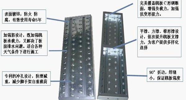 有橢圓沖孔設(shè)的鋼跳板可以讓產(chǎn)品本身減重,易排積水,同時增加磨擦力使防滑的效果倍佳.