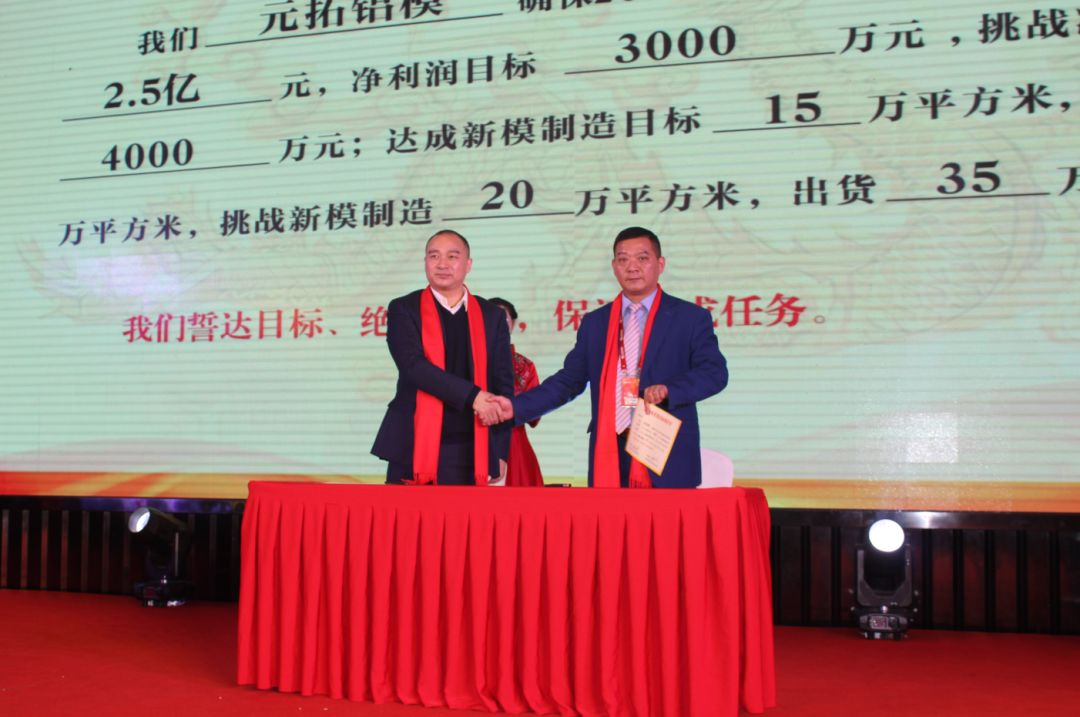 現場,元拓建材集團董事長游炎明與三大業(yè)務板塊領頭人簽訂了2019年度經營目標挑戰(zhàn)承諾書,三位領頭人再把任務進行詳細分解并與下屬團隊負責人簽署了目標責任書。全體業(yè)務、生產骨干紛紛在臺上宣誓,2019年將全力以赴,堅決完成挑戰(zhàn)目標。